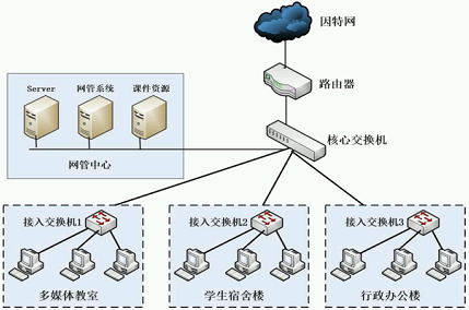 【26】某学校的多媒体教室、学生宿舍楼、行政办公楼通过"接入交换机"各自组建网络,三部"接入交换机"连接上级核心交换机,学校网管中心连接核心交换机,核心交换机连接路由器,实现因特网接入。该校园网络结构如图所示,结合图示回答下列问题: